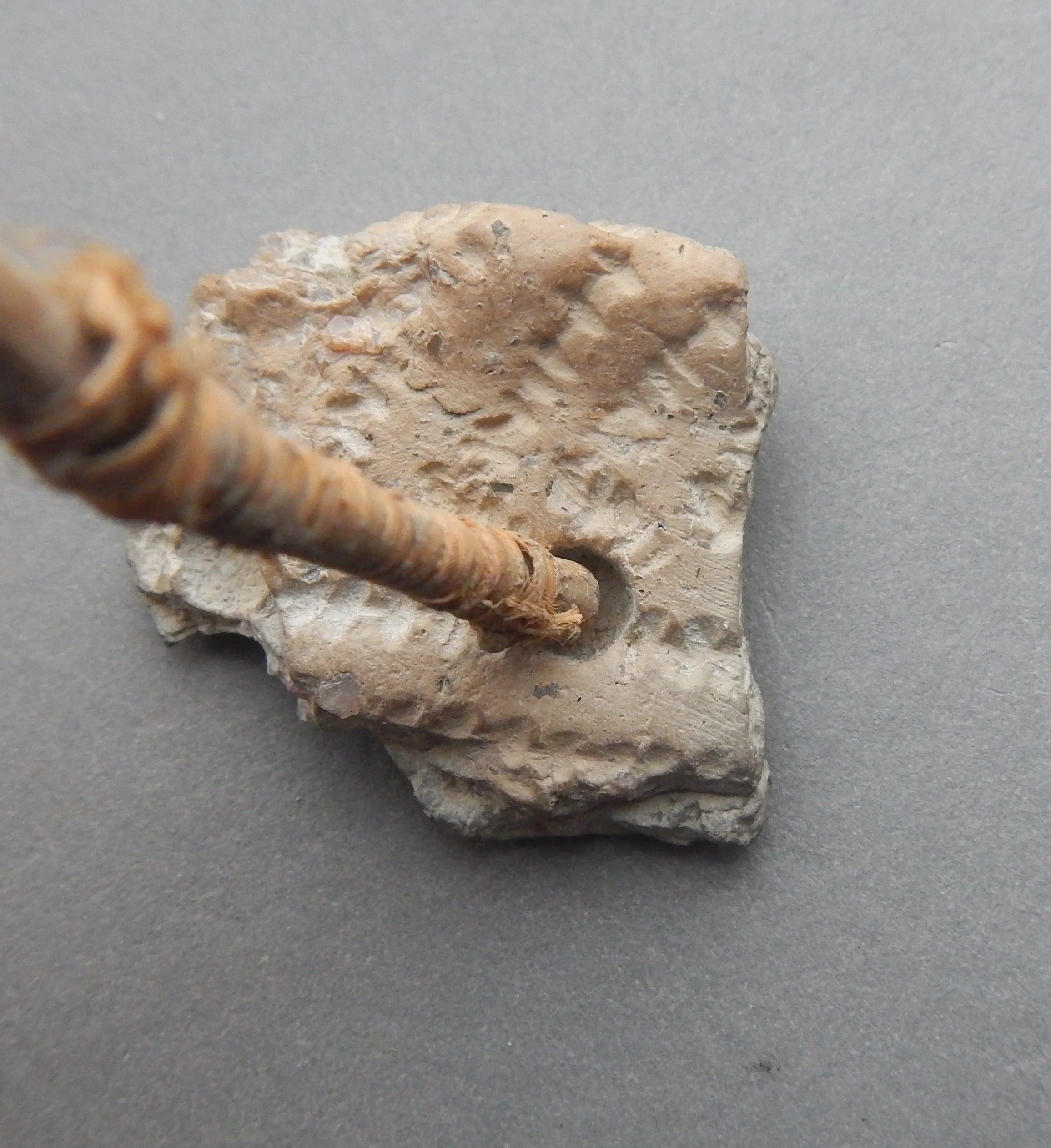 On the above rim sherd, It is likely that as the circular tool was being pressed into the surface of the pottery by the potter, they also held a finger on the interior side of the pot to stop the tool from going all the way through. Therefore, in this instance a fingerprint impression was made on the corresponding “boss”. Sometimes the wet clay on the interior of the vessel is smoothed over before it dries removing both the fingerprints and the bosses. However, in this case the interior of the pot was not wiped before the clay dried allowing the fingerprints to remain on the bosses. This is so cool on many levels, but is particularly thrilling as it paints the image of an individual potter. A person with an identity who created the clay pot so many years ago.