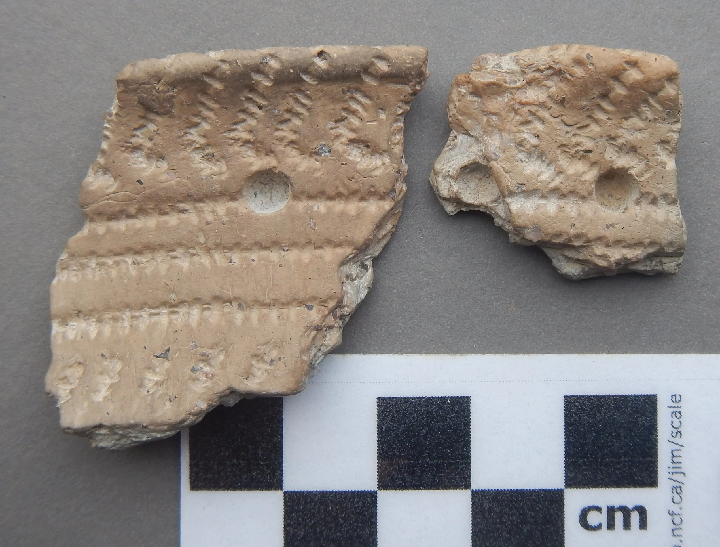 Exterior view of two Late Woodland pottery rim sherds belonging to one vessel recovered from site EaKa-1