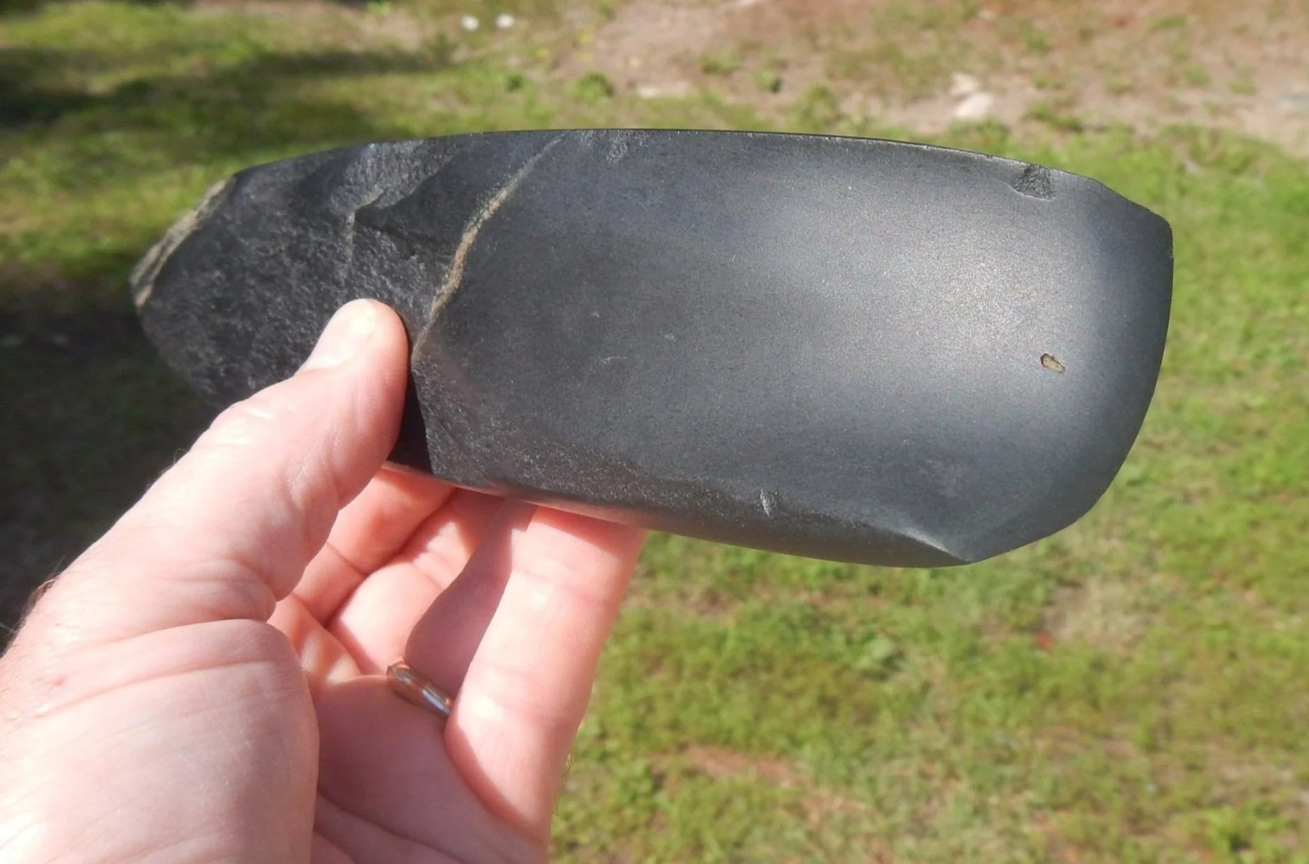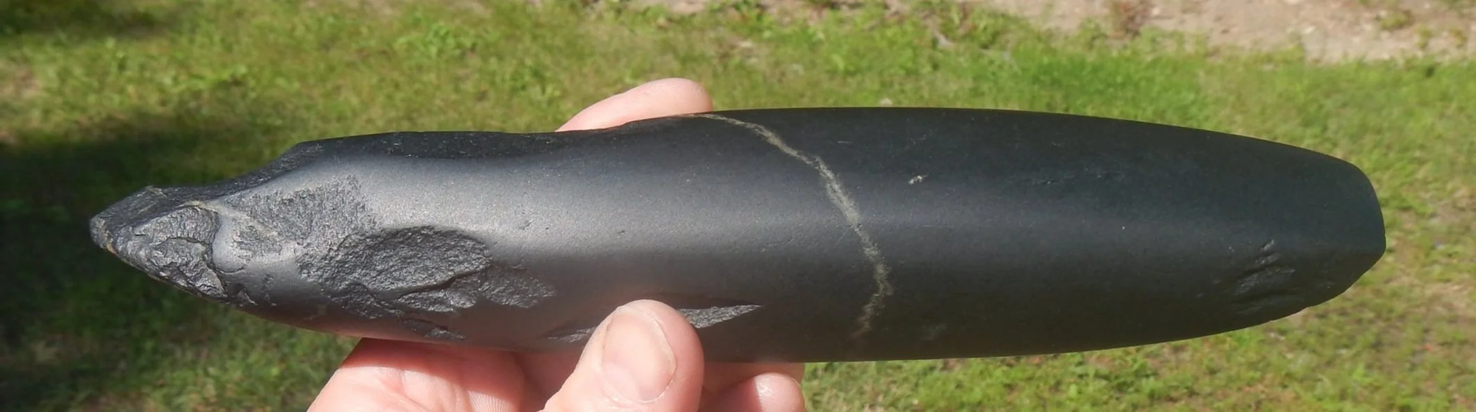 I removed the remaining clay from the grooved section of the piece and then gave it a quick dunk in the water to rinse it off. I was both amazed and exhilarated as I examined the highly polished artifact that I held in my hand. On a trip to Toronto previous to this discovery I had visited the Royal Ontario Museum (ROM) and had observed a similar artifact on display there classified as a “grooved gouge” (3-d model courtesy of Lakehead University anthropology department). The curved end of the artifact with the “groove” is quite sharp. My understanding is that this tool would have been hafted within some kind of wooden handle and likely functioned as chisel for wood working activities. This particular gouge is 23.5 centimeters long, 5.4 centimeters wide and weighs 680 grams.