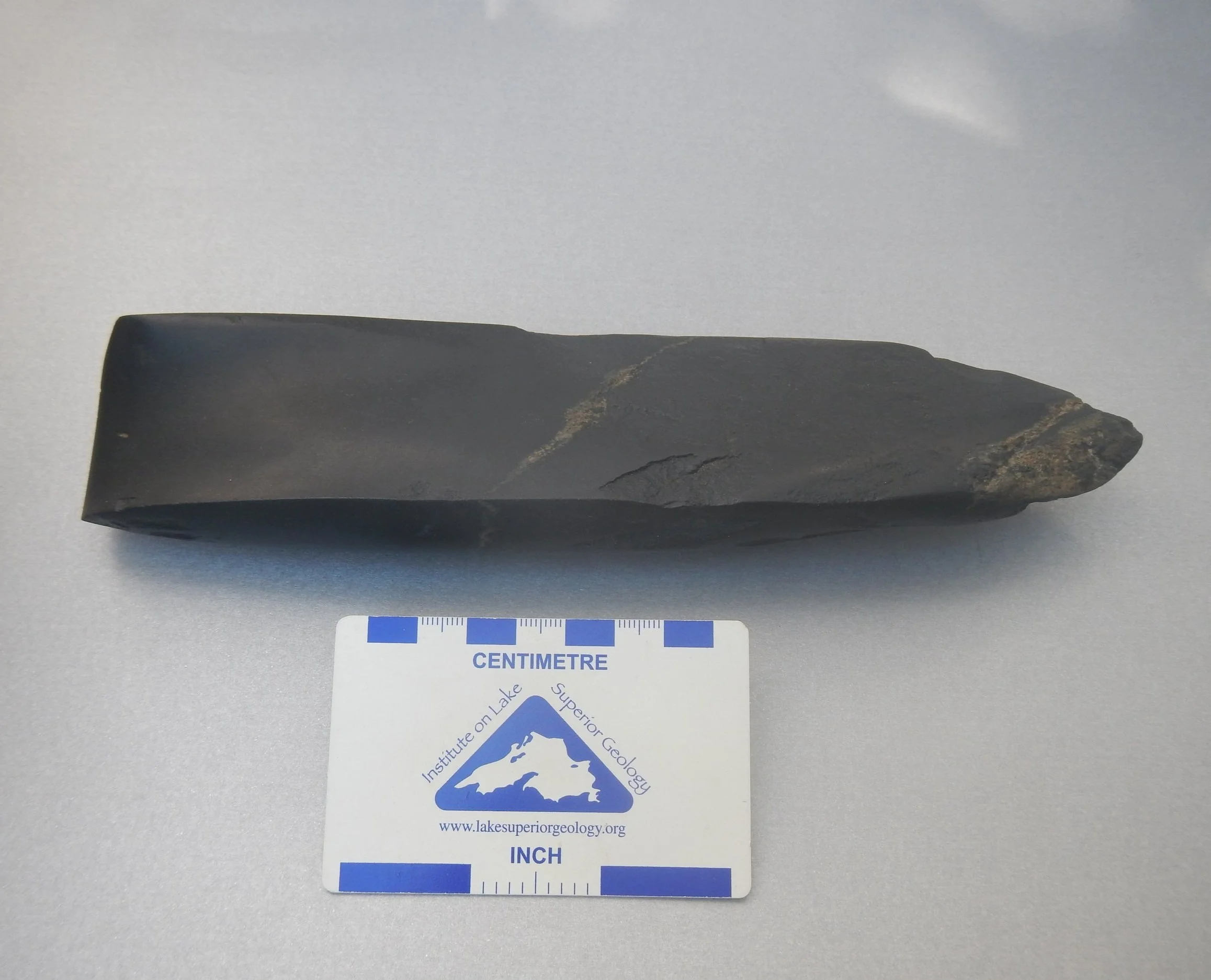 In the early spring of 1991 while I was walking along the submerged shoreline of an island on Lac Seul I noticed a rock that was completely black and rectangular in shape. This struck me as a bit peculiar so I bent over to pick it up. I should mention that this rock was situated about 20 inches underwater and also that I was wearing a pair of hip waders which enabled me to move along an undulating shoreline through various depths of water without worrying about getting a boot full (which had happened on previous occasions when I was wearing just a regular pair of rubber boots).