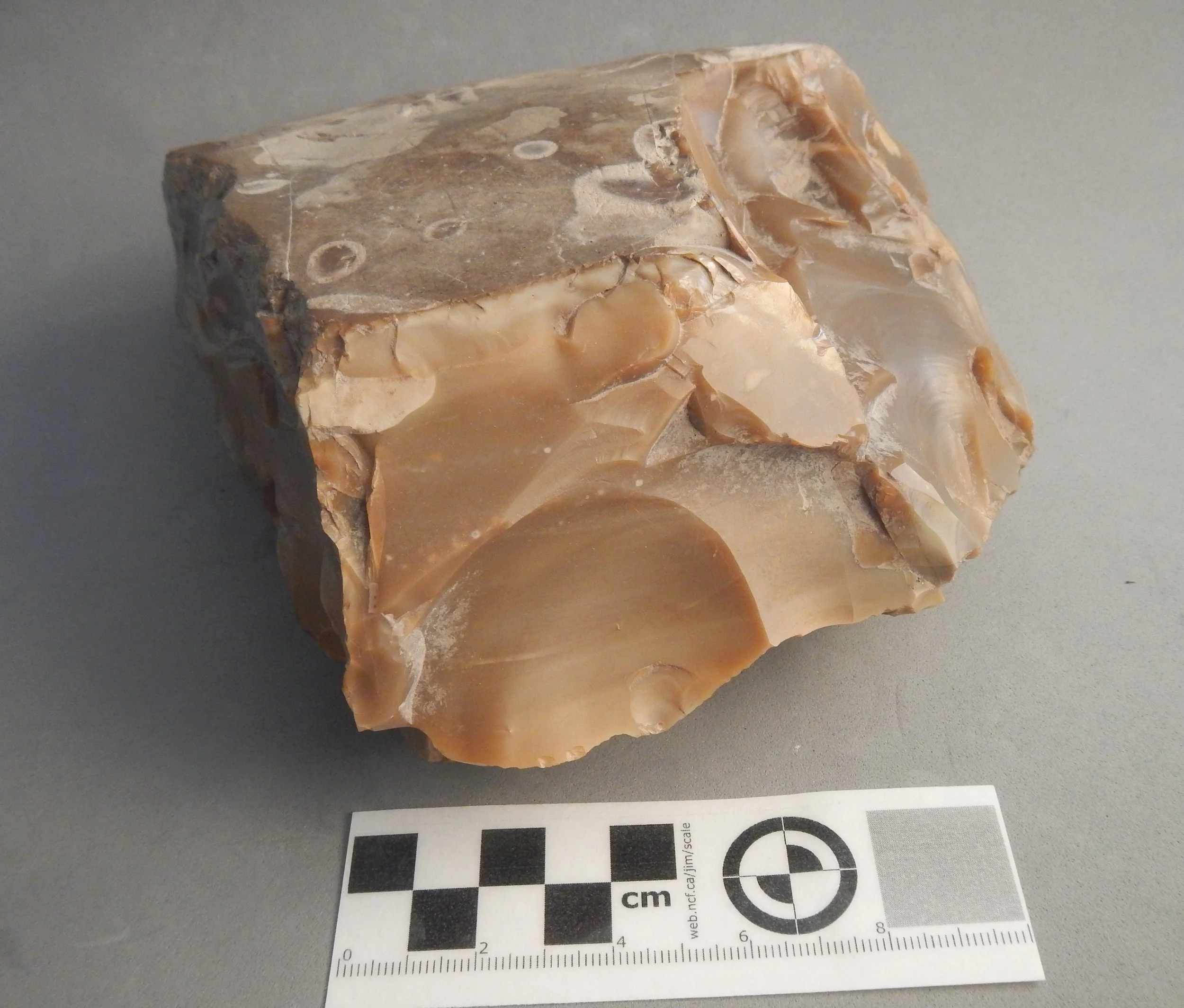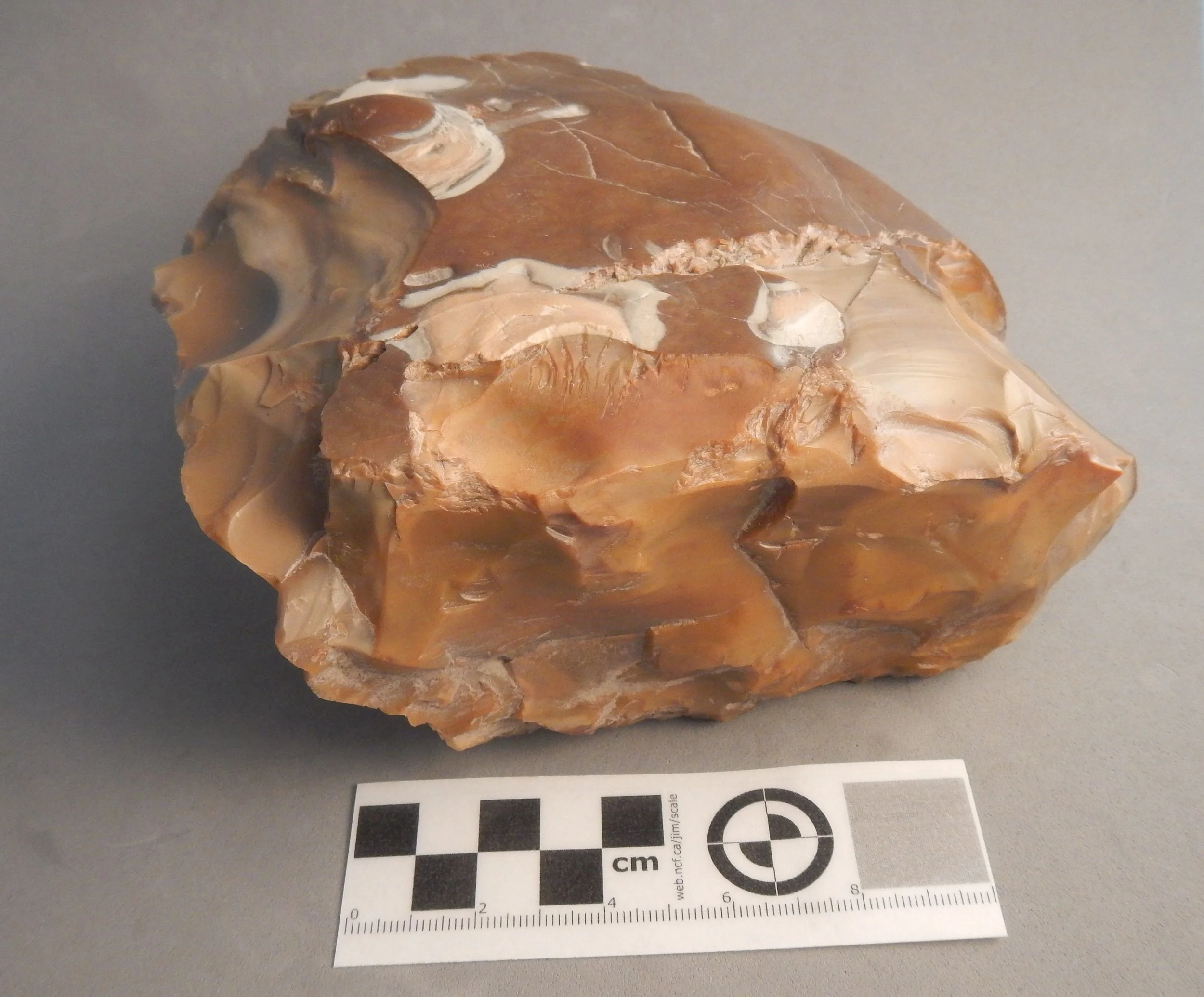 The outside surface (with the circular inclusion looking like an eyeball) has a darker brown shade which represented the exterior patina (outer cortex) of the cobble. The interior of the core is a mottled lighter shade of brown almost the colour of MacIntosh toffee. This type of chert has a high silica content making it an excellent raw material for flint knapping stone tools. As measured the current dimensions of this artifact are 16.5 cm (length) x 15.4 cm (width) x 8.8 cm (height) and it has an over weight of 2,295 grams (2.29 kilograms).