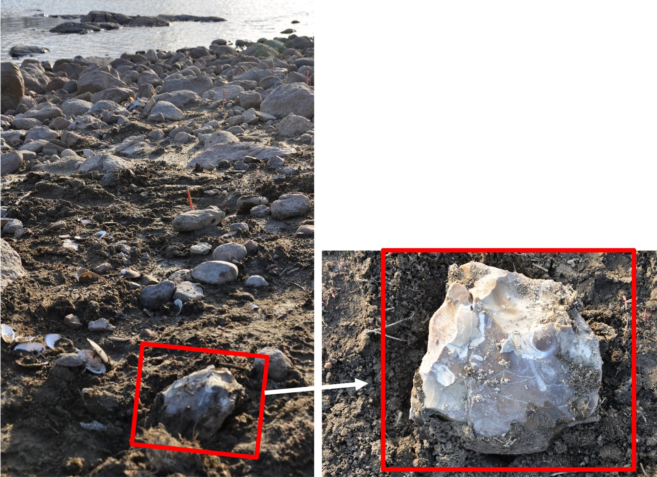 In early May of 2010, I headed up to the northeast section of Lac Seul for a weekend archaeology trip to visit the site designated as EcJw-1. While walking the shoreline and visually examining the ground, something unusual caught my attention. A large rock with a somewhat large, circular inclusion (looking a bit like an eyeball) was poking out of the ground. Most of the rock was embedded within the shoreline soils, but the surface of one side was exposed. For a second it was as though it was staring up at me!
